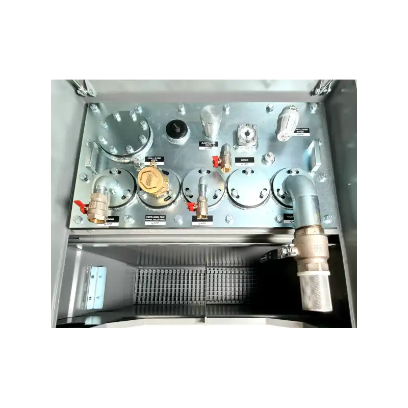 - Oberer Rahmen mit Halterungsmöglichkeiten für Abgabeschlauch und Zapfpistole